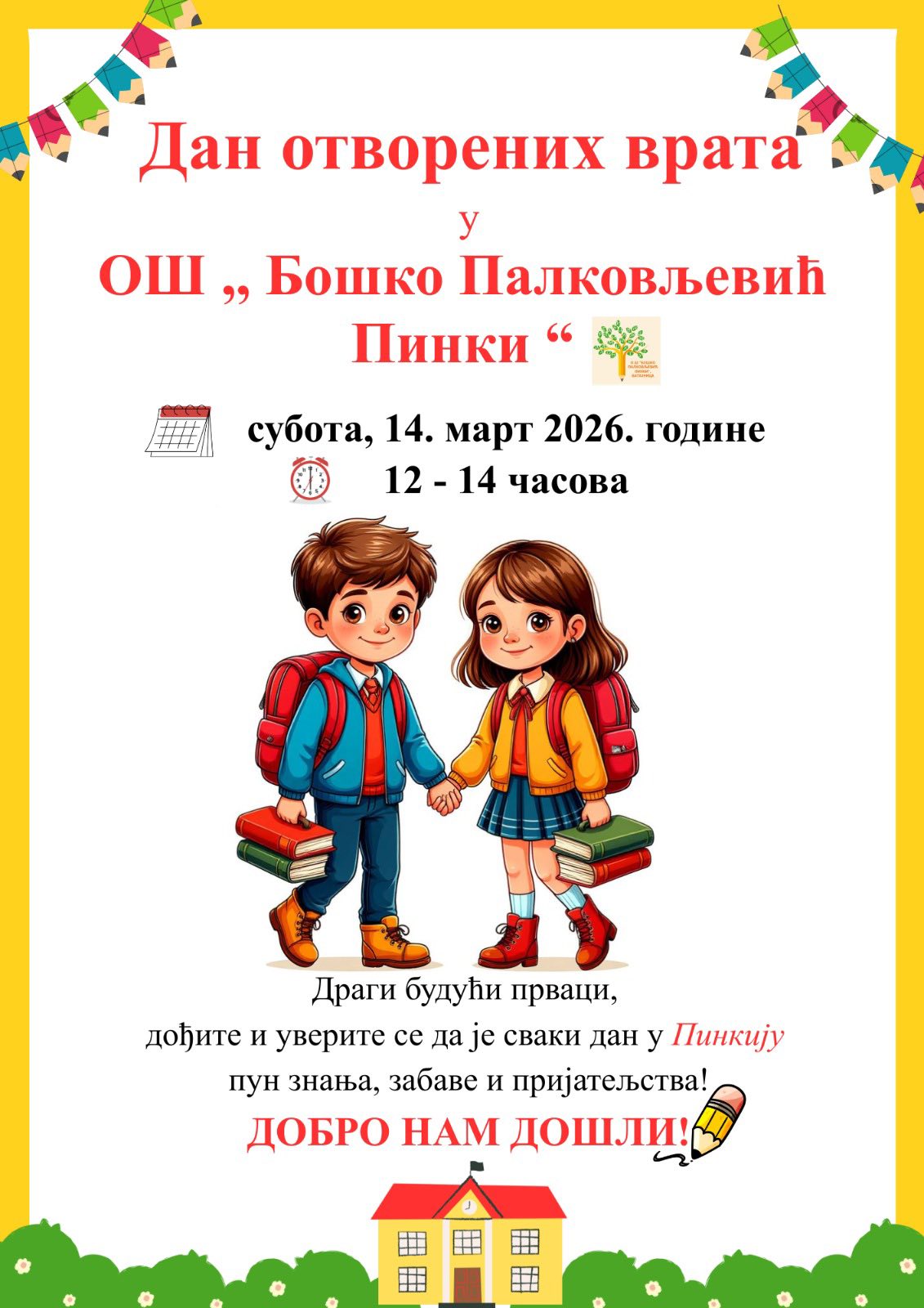 Са великом радошћу позивамо све будуће прваке и њихове родитеље да нас посете у суботу, 14.марта 2026. године, у периоду од 12 до 14 часова. Тог дана имаћете прилику да упознате наше учитеље, обиђете школу, завирите у учионице и сазнате све о настави, активностима и школском животу у ОШ "Бошко Палковљевић Пинки". Желимо да вам покажемо да је сваки дан у нашој школи испуњен знањем, радошћу, креативношћу и другарством.